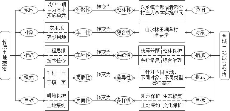 全域土地综合整治既有对传统土地整治的继承,也有突破和创新,更加强调整治范围的整体性、整治对象的综合性、整治措施的系统性、整治模式的差异性以及整治目标的多样性,为实现乡村重构提供了重要的本底支撑。在整治范围上,全域土地综合整治以乡镇(或者部分村庄)为基本实施单元,从区域视角整体推动乡镇或者村庄规划、设计和整治。在整治对象上,全域土地综合整治以区域内山水林田湖草全要素为整治对象,统筹推进资源优化配置、生态功能修复和传统文化保护等。在整治模式上,全域土地综合整治针对不同区域、不同对象、不同类型整治需求实施差别化整治,延展土地整治的产业链和价值链,因地制宜注入新型业态。在整治措施上,全域土地综合整治将农艺措施、生物措施与工程措施相结合,解决以自然保护和恢复为主的各类问题,实现山水林田湖草全要素整体保护、系统修复和综合治理。在整治目标上,全域土地综合整治不仅强调耕地保护和土地集约利用,也强调改善农村人居环境,保护和恢复乡村生态功能,保护乡村历史文化资源。